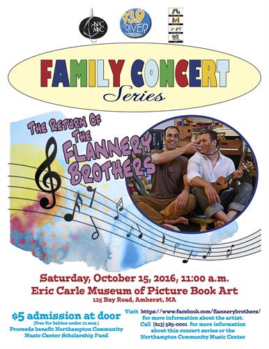 The Northampton Community Music Center, 93.9 The River, and The Eric Carle Museum of Picture Book Art present their Family Concert Series featuring musical group The Flannery Brothers. The concert is Saturday, October 15th, 2016 at 11 AM at the Eric Carle Museum of Picture Book Art on 125 West Bay Road in Amherst, MA. Admission is $5 per person and free for infants aged 0-12 months at the door. Proceeds benefit the Northampton Community Music Center Scholarship Fund.