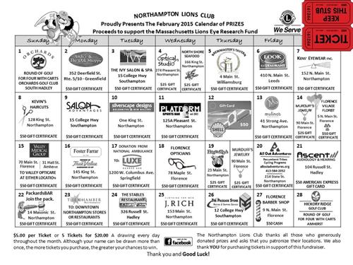 The Northampton Lions Club February 2015 Calendar of Prizes is a great deal - $5.00 per calendar ticket or 5 calendar tickets for $20.00 A drawing every day throughout the month of February. Although your name can be drawn more than once,... the more tickets you purchase, the greater your chances to win.