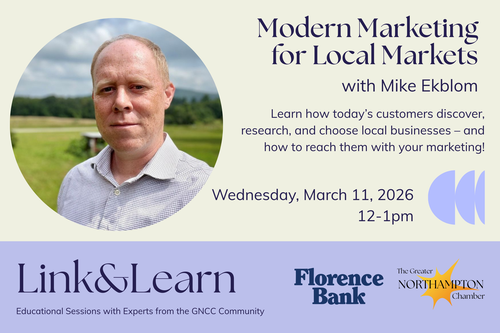Local businesses have more marketing options than ever — yet many owners feel less certain about what’s actually working. Modern Marketing for Local Markets can help! In this free Link&Learn, we’ll explore how today’s customers really discover, research, and choose local businesses, and why aligning your marketing with that behavior matters more than chasing the next platform. You’ll leave with a clearer, practical framework for approaching modern marketing with confidence. Presented by Mike Ekblom, Vice President/General Manager of Northampton Media Group and Springfield Rocks Media Group. Sponsored by Florence Bank.