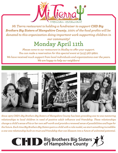 Please join us at Mi Tierra restaurant in Hadley for a fundraiser to support Big Brothers Big Sisters of Hampshire County. 100% of the food profits will be donated to support our work advocating for vulnerable children. All you have to do is come and enjoy a meal!