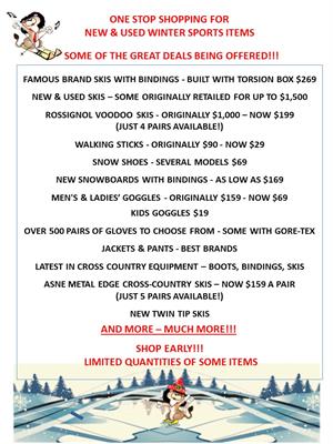 The deals are great! . . . AND the assortment of skis, boots, skates, skateboards, clothing, and other winter sports items is tremendous. Low prices and deep discounts! Cash, checks, and most credit cards accepted. The sale on Saturday, December 6th, will be the best sale ever!!!