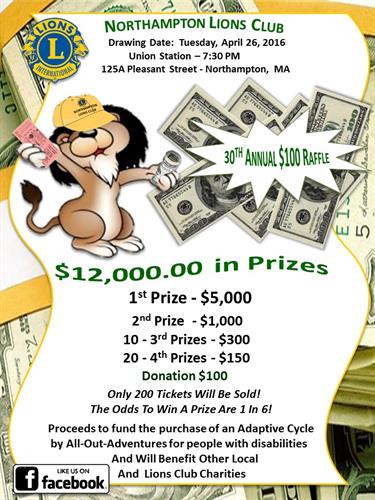 The Northampton Lions Club's 30th Annual $100 Raffle is underway . . . Tickets make wonderful gifts for any occasion OR FOR NO REASON AT ALL - the gift that keeps on giving!!! Please contact Northampton Lion Mark Moggio (413-320-1780; mamoggio@comcast.net) to purchase that ticket or tickets with your lucky number(s).